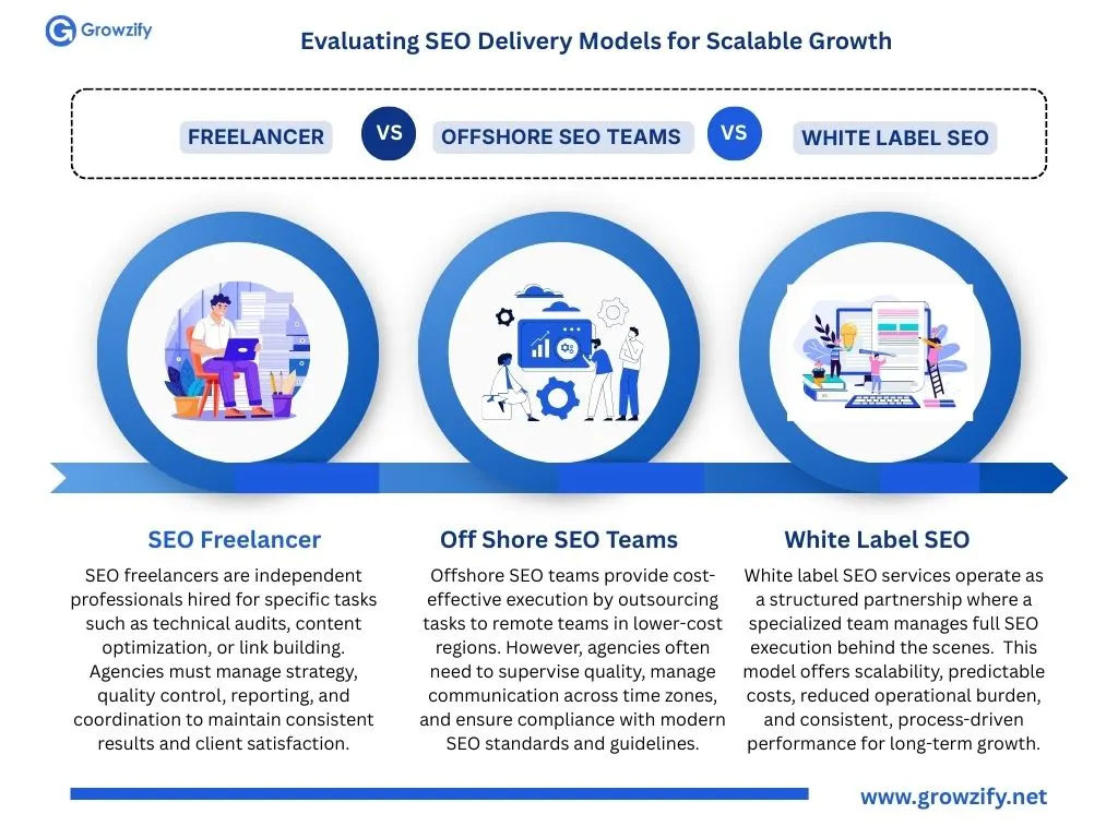 Scaling an SEO agency requires the right execution model. This guide compares white label SEO, freelancers, and offshore teams breaking down cost, control, scalability, and long-term growth potential to help you choose the best solution for sustainable expansion.