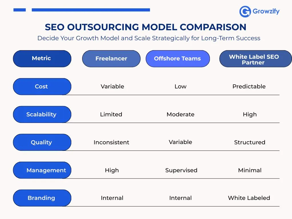 The right SEO model should scale alongside your business without creating operational disruptions or increasing risk. This is a critical factor to consider when choosing between freelancers, offshore teams, or a white label SEO partner, as each model impacts stability, scalability, and long-term growth differently.